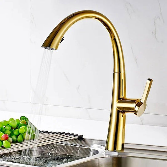 Single Handle Rotatable 1-Hole Pull Out Kitchen Faucet with Dual-Function Solid Brass in Gold